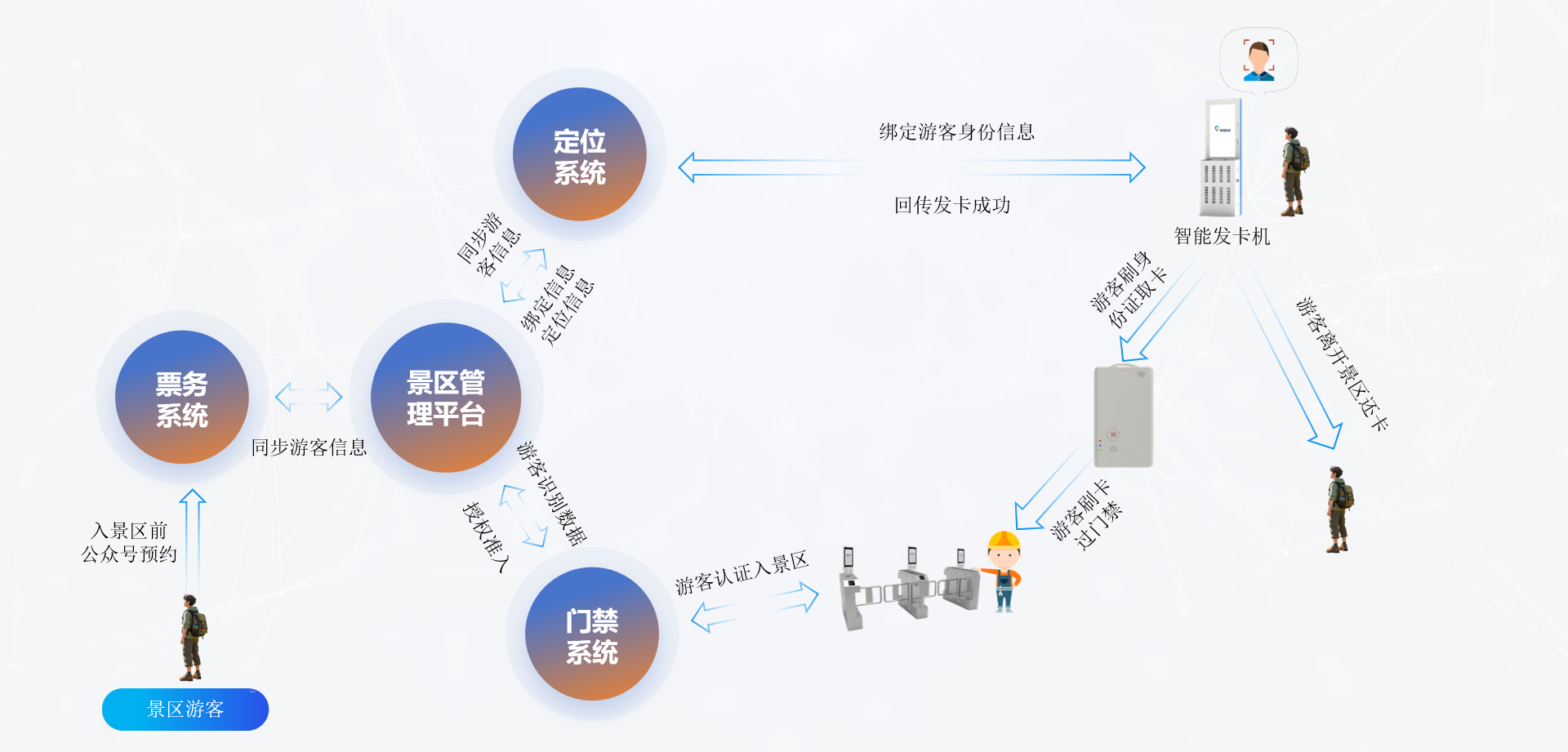 在景區安全管理方面,新銳科創北斗定位卡可以聯動發卡機、定位系統、門禁系統、票務系統、景區管理平臺,構建景區完整的智慧化管理閉環。各系統間高度協同,確保了從游客預約、取卡、刷卡過門禁、進入景區打卡到離開景區的全流程數據無縫流轉。以下是景區系統聯動方案圖: