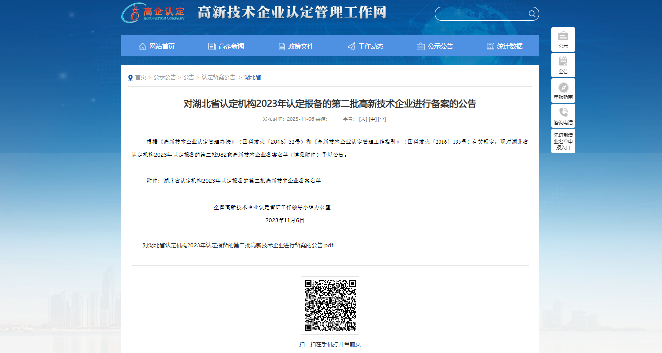 在這個科技日新月異的時代,創新已經成為推動社會進步的重要動力。近日,根據《高新技術企業認定管理辦法》(國科發火〔2016〕32號)和《高新技術企業認定管理工作指引》(國科發火〔2016〕195號)有關規定,對湖北省認定機構2023年認定報備的第二批982家高新技術企業備案名單(詳見附件)予以公告。新銳科創(湖北)科技有限公司喜獲佳音,成功通過2023年高新技術企業備案。