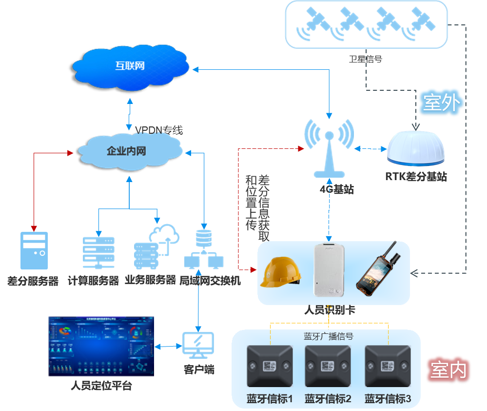 新銳科創RTK+藍牙融合定位系統則巧妙地化解了這一難題。在露天礦的開闊區域,RTK技術借助衛星信號與地面基站的誤差修正機制,能夠實現亞米級的高精度定位。通過在已知精確坐標的固定位置設立基準站,基準站持續接收衛星信號,并精確計算出衛星信號與自身精確位置的偏差,即差分改正數。隨后,這些差分改正數通過4G或其他通信鏈路迅速發送給移動站,如人員佩戴的定位終端。移動站在接收衛星信號的同時,接收基準站發來的差分改正數,對自身接收到的衛星信號進行修正,并利用高精度定位算法,最終實現亞米級定位。