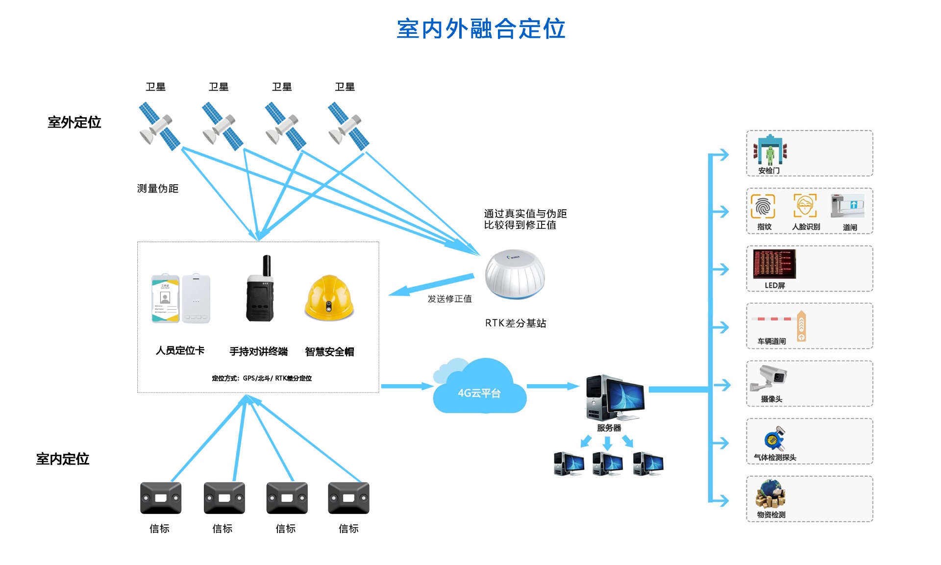 室外基于GPS/北斗RTK差分技術進行定位,利用RTK差分定位基站提升GPS/北斗衛星定位的精度,在室外架設一臺已知坐標的差分定位基站,差分定位基站根據已知坐標和自己觀測到的衛星定位數據求出修正值,并將修正值發送給定位終端(比如人員定位卡),定位終端利用差分基站發送的修正值,對自己觀測到的衛星定位數據進行修正,從而實現精確定位。