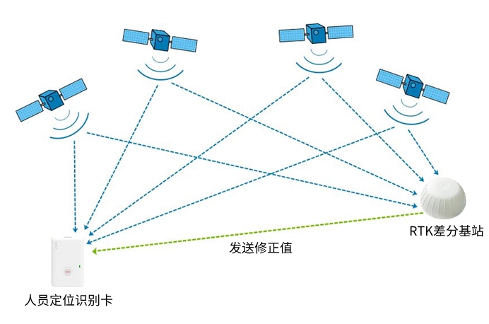 該系統室外部分,在北斗定位的基礎上利用RTK差分定位技術提升室外定位精度。差分校正需要基站接收器(RTK差分定位基站)和移動接收器(融合定位識別卡)同時接收衛星信號,RTK差分定位基站的位置已知,可以通過實際測量值與已知位置值來獲得修正值,融合識別卡的位置是需要測量的,它的誤差可以通過RTK差分基站發送的修正值來消除。