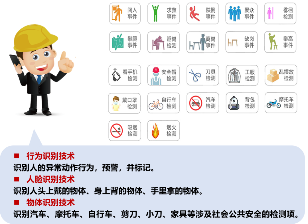 新銳科創智能視頻AI識別系統利用計算機圖像視覺分析技術理解視頻畫面內容,系統將圖像處理、模式識別、智能分析以及信號處理等先進算法技術融入多元化場景中,通過算法優化分離場景背景與目標,從海量圖像中自動發現、分析人的異常行為并立即進行處理,實現包括入侵檢測、圍墻翻越檢測、群體事件檢測、離崗檢測等行為識別,通過運用人工智能的方式來提升監控中心管理的智能化和便捷度,為智能安防提供一站式解決方案。