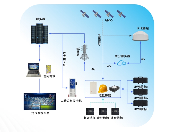 室內定位:在室內或衛星信號遮擋較嚴重的區域,系統采用藍牙和UWB技術進行融合定位。藍牙信標負責廣播位置信息,人員佩戴的定位終端(標簽)掃描藍牙信標廣播信息,并結合UWB技術進行雙向測距,計算出位置后通過4G網絡上傳至服務器。這種方式既保證了定位精度,又實現了低功耗和遠距離傳輸。