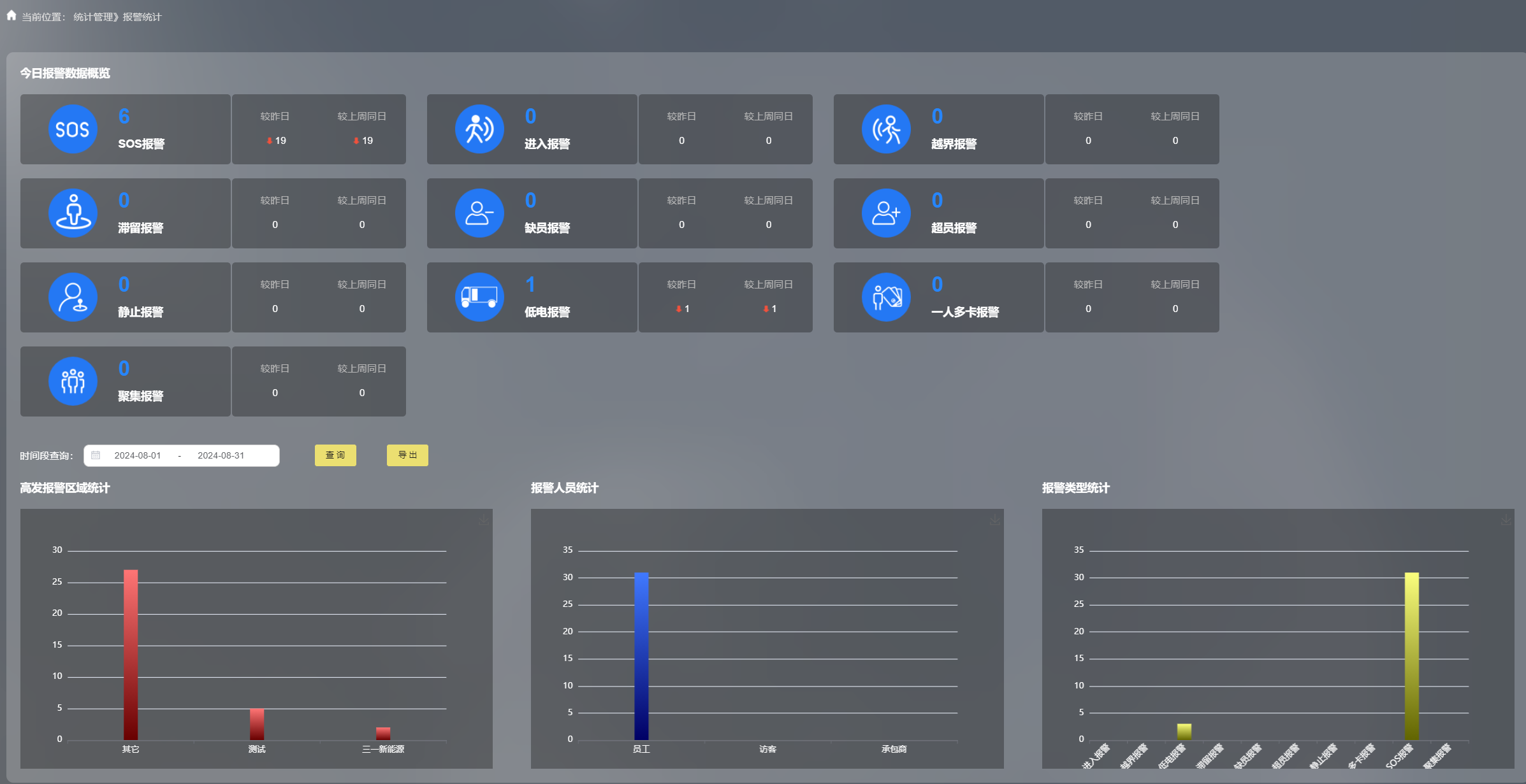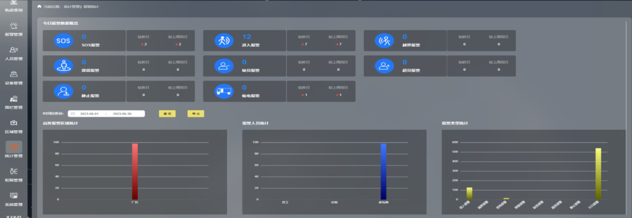 支持各類數據實時統計分析,提供全面的數據報表和可視化工具,以表格、熱力圖等形式展示各區域人員分布及報警信息等關鍵數據。