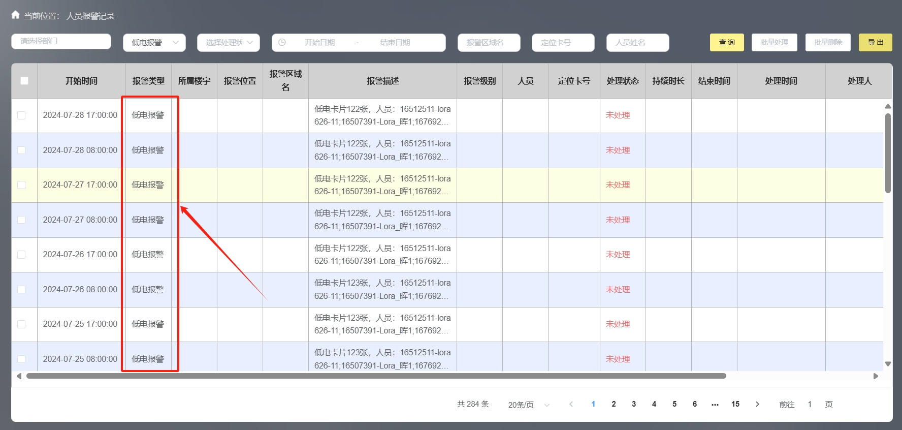 系統中可監控人員識別卡電量、故障情況,電量低的情況下可提醒員工對定位卡進行充電。