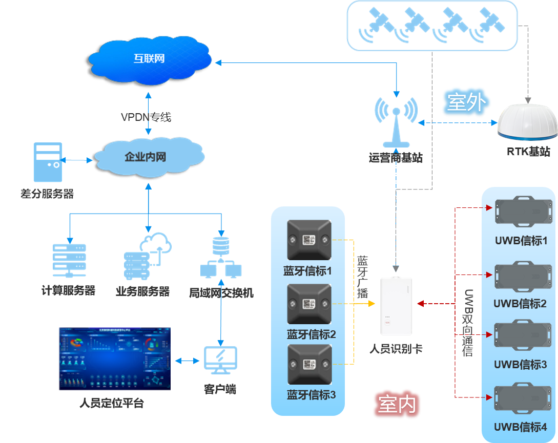藍(lán)牙+UWB+RTK人員定位系統(tǒng)。室內(nèi)利用藍(lán)牙+UWB進(jìn)行定位,室外利用GPS/北斗RTK進(jìn)行定位。該系統(tǒng)具有功耗低、維護(hù)簡單、靈敏度高、覆蓋范圍廣、安全穩(wěn)定、成本可控、精度高等特點,能夠?qū)崿F(xiàn)實時定位追蹤、歷史軌跡查詢、電子圍欄、智能預(yù)警、一鍵報警求救、監(jiān)控視頻聯(lián)動、統(tǒng)計分析等功能。