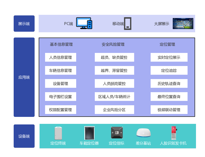 應用端:根據管理需求,實現定位管理、安全風險管理、基礎信息管理等功能應用;并可通過接口二次開發,基于人員定位進行新的功能應用。