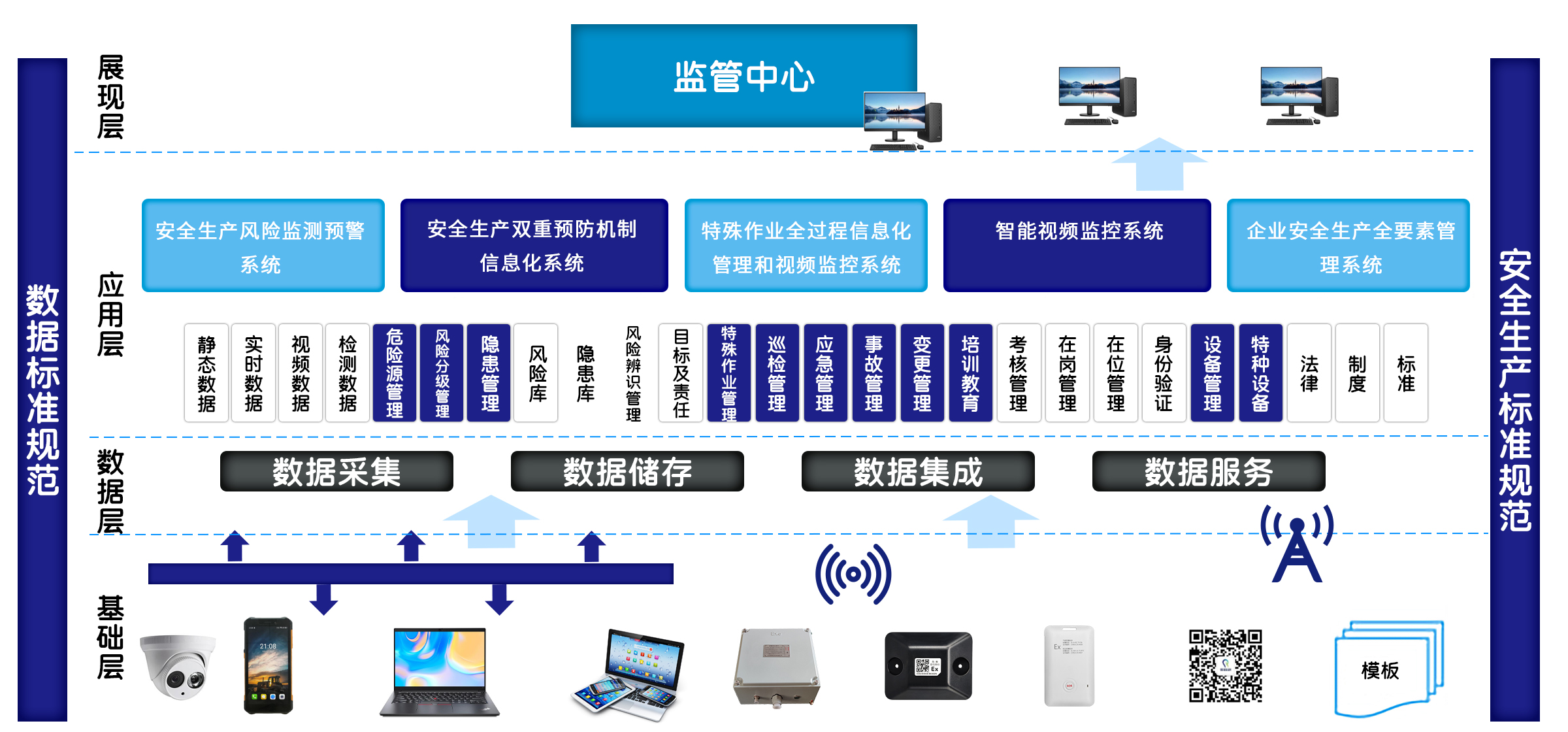 基于事故致因理論、事故演化理論、風險管理理論、動態風險評估方法及相關數學模型等,根據“四個層級”(基礎設施層、數據支撐層、應用服務層和綜合展現層)與“兩大體系”(安全運維保障體系和數據標準規范體系)架構開發建設,為企業安全生產提供風險監測預警與防控集成化一體化解決方案。
